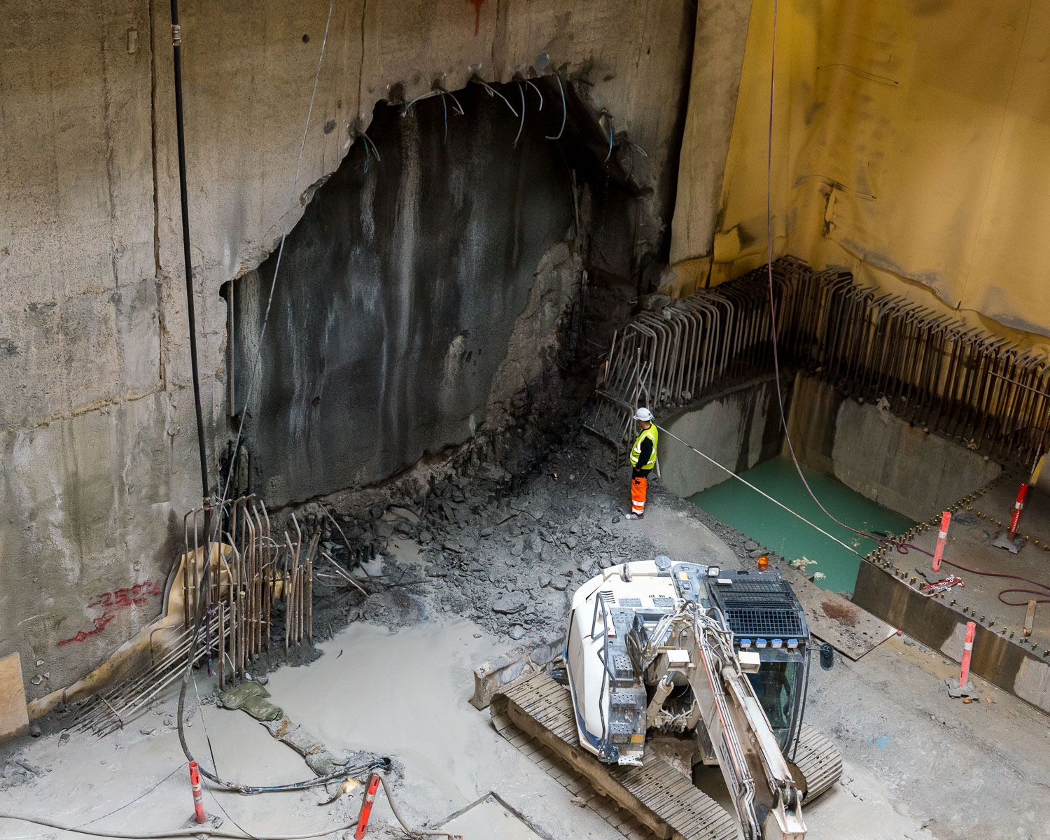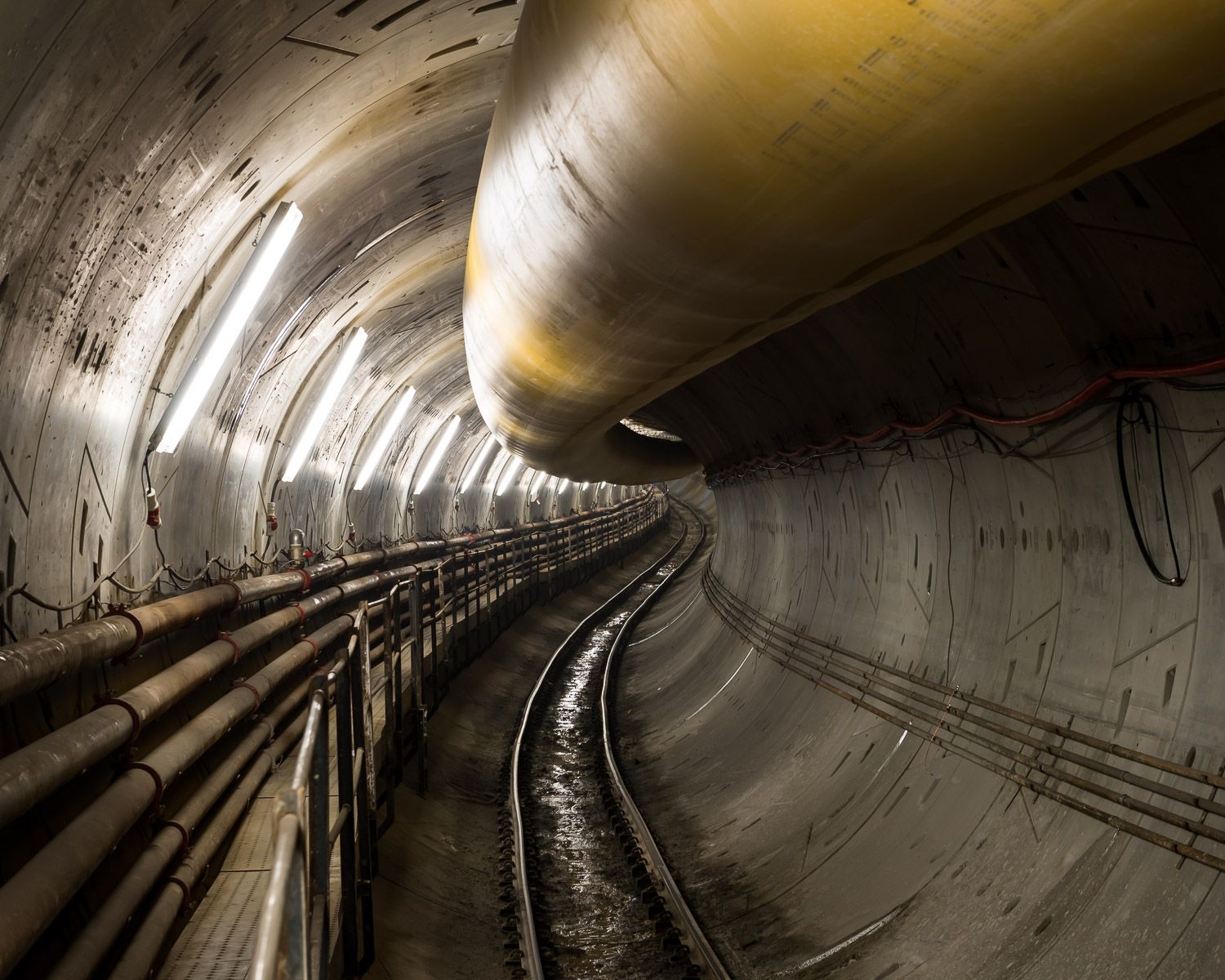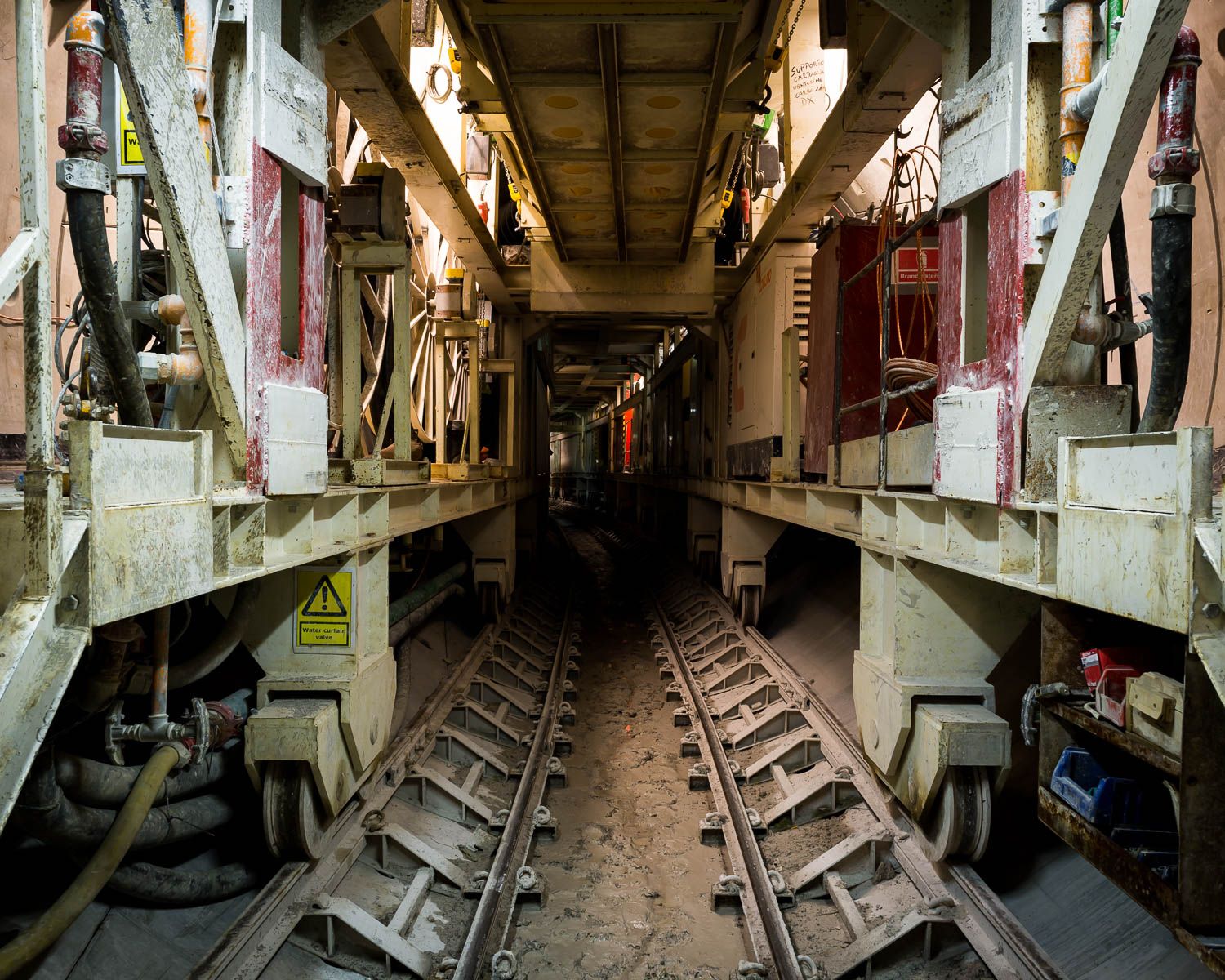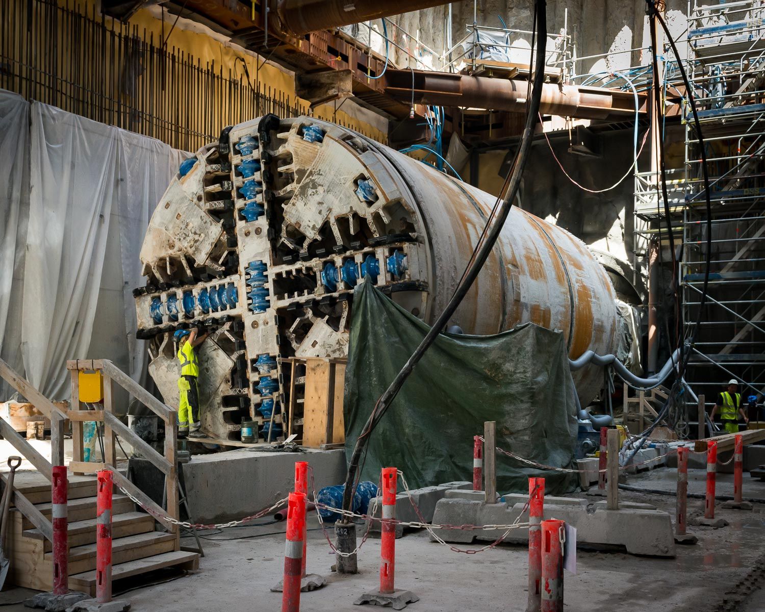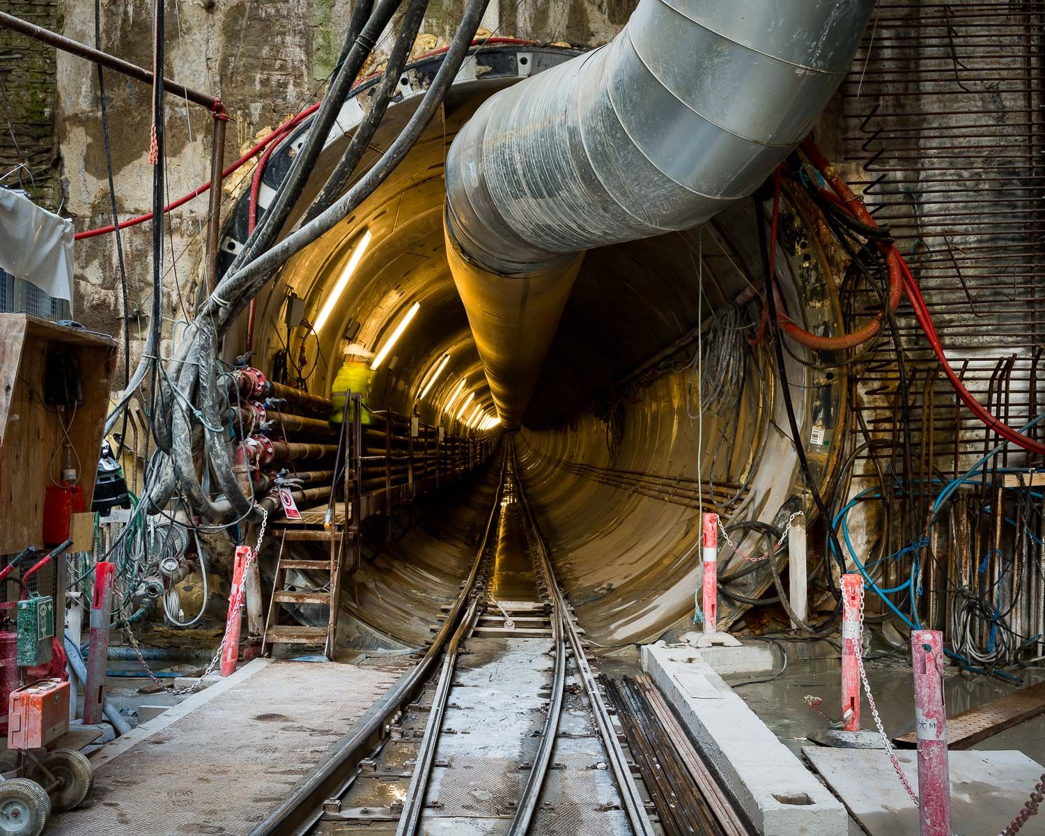 My first underground visit was in May 2013 before any drilling had begun, on the day that one of the two brightly painted, brand-spanking new drill heads was lowered into the abyss. Since then these 50-ton heads have crawled slowly forward and completed all of of the 15.5km route. The drilling machine has built the whole tunnel as it goes: the drill goes into a wall and leaves a finished tunnel behind it. It drills through the limestone about 30 metres under Copenhagen, re-enforces the walls and lays concrete sections in rings that have been pre-made in Germany.